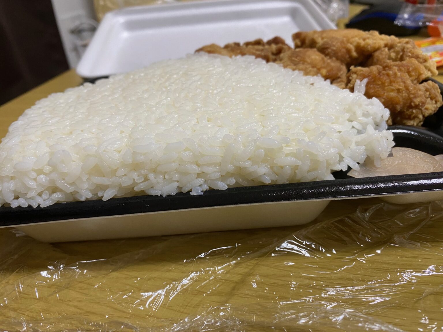 唐揚げの個数ご飯の量が選べるスタイルで、棚に置いてあるのは“空箱”。レジに空箱を持っていき会計→作ってもらう流れです。せっかくなので唐揚げ10個+ご飯特盛を注文しました(中学時代は普通盛りだった記憶)。