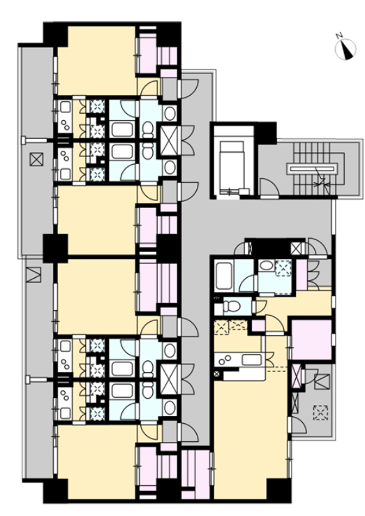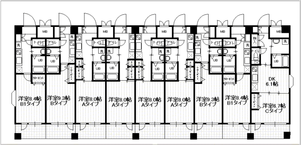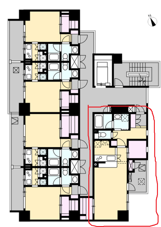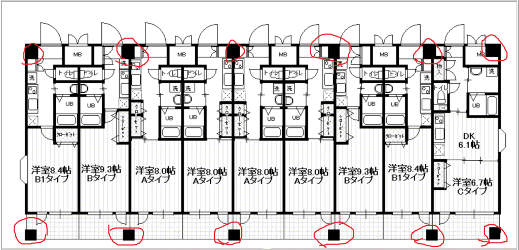 ということは先ほどの画像のようにフロアの部屋数が奇数のマンションの場合、両壁がコンクリ壁の部屋がフロアに一部屋だけ存在することになります。そこを積極的に狙っていきましょう。