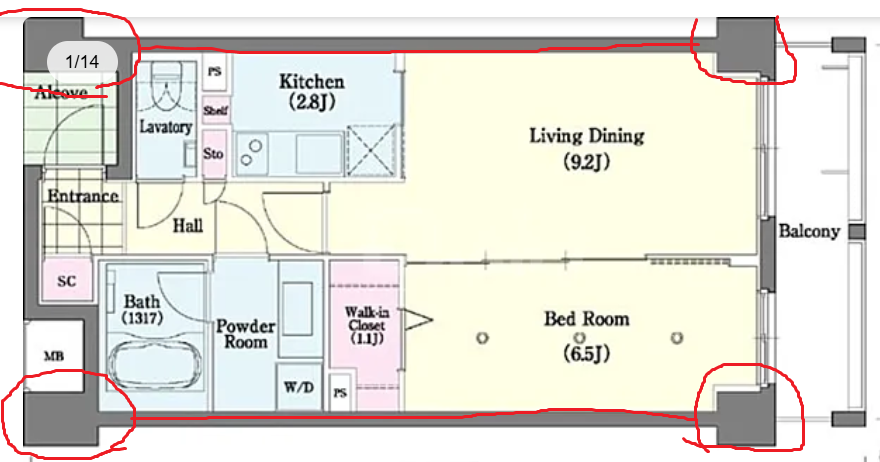 - 角部屋=必ず静か → △ 外部騒音の影響もある 戸境壁が薄い可能性あり 間取り図の「鉄筋の柱■」に注目する